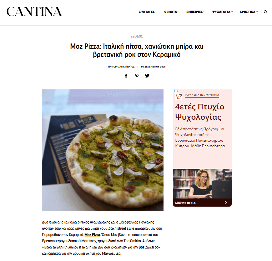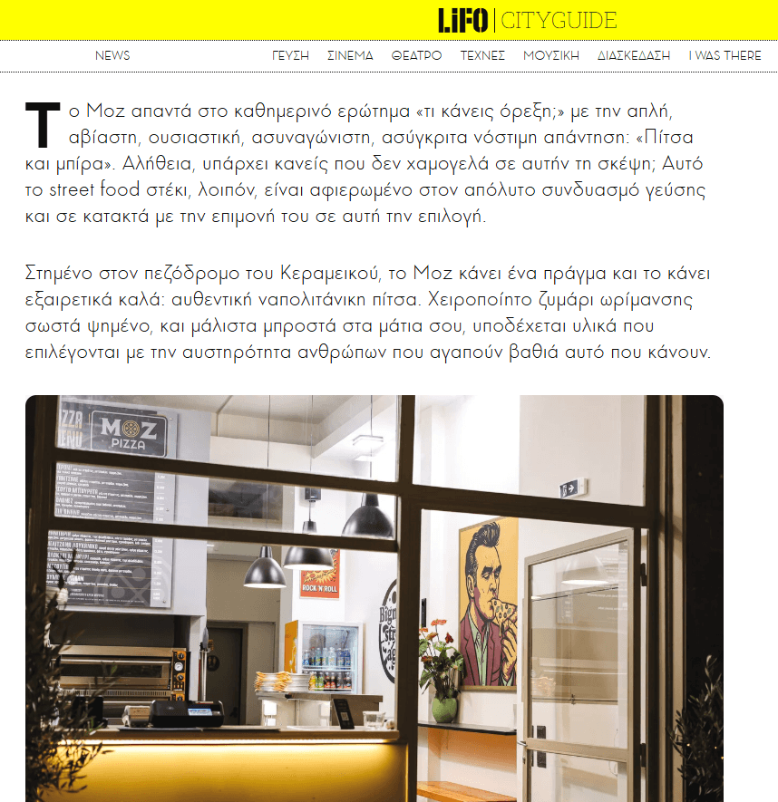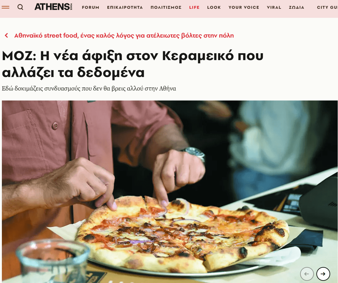 Στον πεζόδρομο της Παραμυθίας, στον Κεραμεικό, γεννήθηκε το Moz Pizza: μια μικρή urban πιτσαρία που σερβίρει αυθεντική ναπολιτάνικη πίτσα με χειροποίητο ζυμάρι, ποιοτικά υλικά και χαλαρή street διάθεση.
